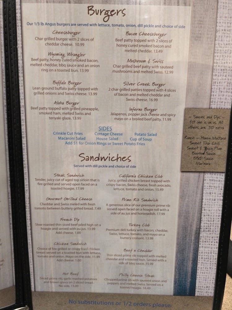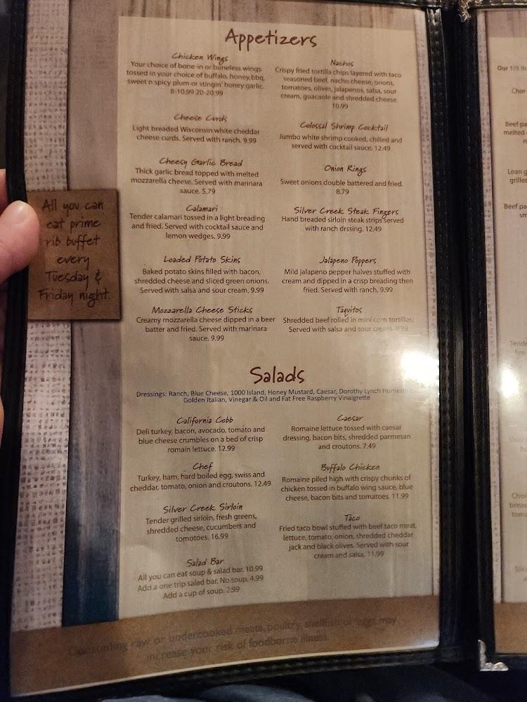 The menu at Silver Creek Steakhouse is diverse, showcasing a strong emphasis on grilled dishes. Signature items like the Prime Rib Dinner stand out, providing a hearty meal. For lunch and dinner, a mix of burgers, sandwiches, and plates fills every craving.